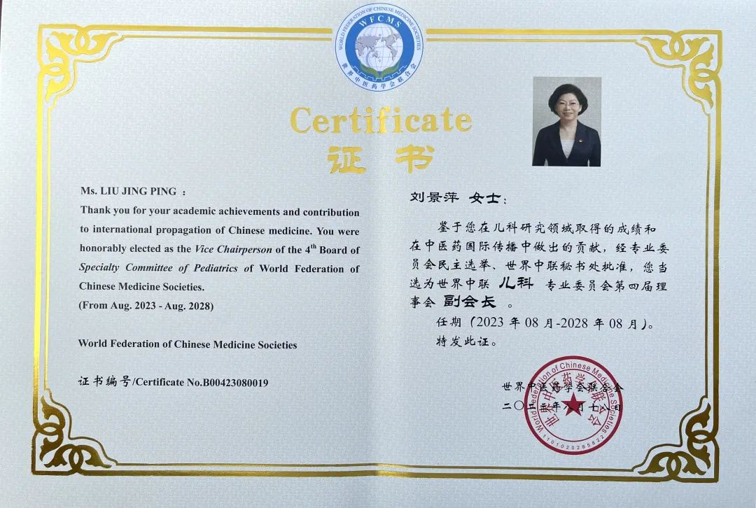 z6com人生就是博·药业集团党委书记、董事长刘景萍当选世界中医药学会联合会儿科专业委员会第四届理事会副会长